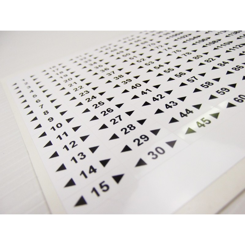 Foglio di etichette adesive per tubo in policarbonato, pretagliate, stampa a trasferimento termico indelebile da 1 a 60 litri con passo di 1 litro e da 62 a 150 con passo di 2 litri.